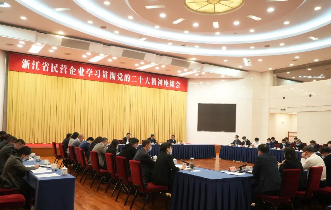 為深入學(xué)習(xí)貫徹黨的二十大精神和省委部署要求,引導(dǎo)廣大浙商堅(jiān)定不移聽黨話、跟黨走,在高質(zhì)量發(fā)展中勇當(dāng)“兩個(gè)先行”排頭兵,為全面建設(shè)社會(huì)主義現(xiàn)代化國家、全面推進(jìn)中華民族偉大復(fù)興作出浙商新的更大貢獻(xiàn),10月26日,浙江省民營企業(yè)學(xué)習(xí)貫徹黨的二十大精神座談會(huì)召開。省委常委、統(tǒng)戰(zhàn)部部長邱啟文出席會(huì)議并講話,省委統(tǒng)戰(zhàn)部副部長、省工商聯(lián)黨組書記徐國龍主持。