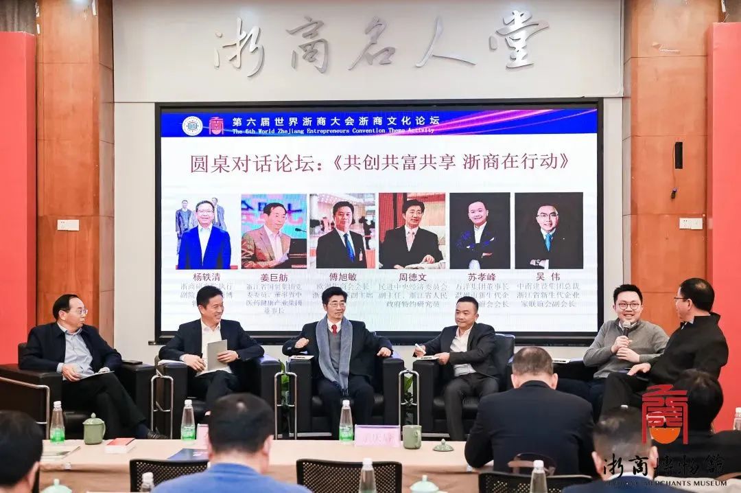 歐洲華商會會長傅旭敏、省中醫(yī)藥健康產(chǎn)業(yè)集團(tuán)董事長姜巨舫、中南建設(shè)集團(tuán)總裁吳偉、萬洋集團(tuán)董事長蘇孝峰、民進(jìn)中央經(jīng)濟委員會副主任周德文,浙商研究院執(zhí)行副院長、浙商博物館館長楊軼清開展了一場圓桌對話,暢談“兩個健康”和“兩個先行”背景下的浙商文化新形態(tài)。