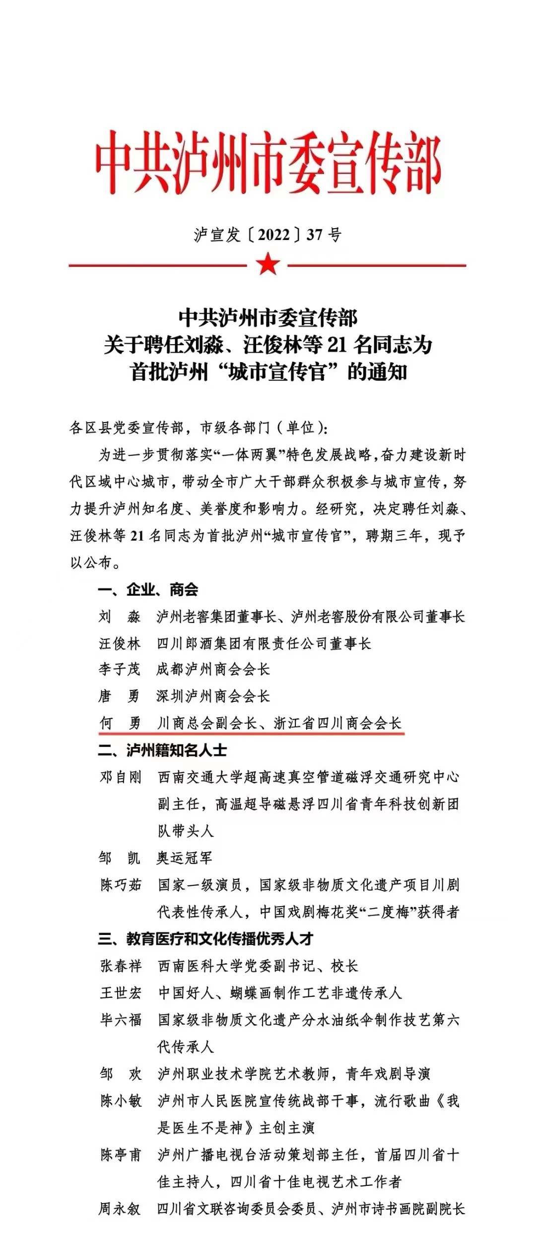 近日,中共瀘州市委宣傳部公布首批瀘州“城市宣傳官”名單,浙江省四川商會(huì)會(huì)長(zhǎng)、朗佑控股董事長(zhǎng)、朗佑堂創(chuàng)始人何勇被聘為首批瀘州“城市宣傳官”。