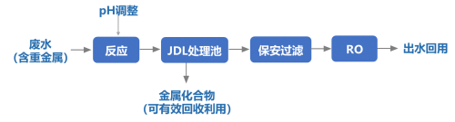 JDL工藝集固液分離、固體懸浮物濃縮、廢水處理回用、重金屬資源回收于一體,實(shí)現(xiàn)了“廢水處理回用+重金屬資源回收”的重金屬廢水處理模式;出水水質(zhì)達(dá)到相關(guān)行業(yè)重金屬廢水排放標(biāo)準(zhǔn),回收重金屬可作為相關(guān)產(chǎn)品直接利用,顯著減少了剩余危廢物,實(shí)現(xiàn)了廢水中有價(jià)金屬的資源化,一定程度上緩解了重金屬危廢處理難題;處理過程中不加入聚丙烯酰胺(PAM)、鐵鹽、鋁鹽等絮凝劑,使膜組件不易堵塞。