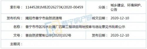 近日,依照《廣東省城鄉(xiāng)規(guī)劃條例》第二十九條規(guī)定,普寧市自然資源局發(fā)布了普寧市市區(qū)污水處理廠四期工程項(xiàng)目用地預(yù)審與選址意見(jiàn)書批前公示,具體內(nèi)容如下:
